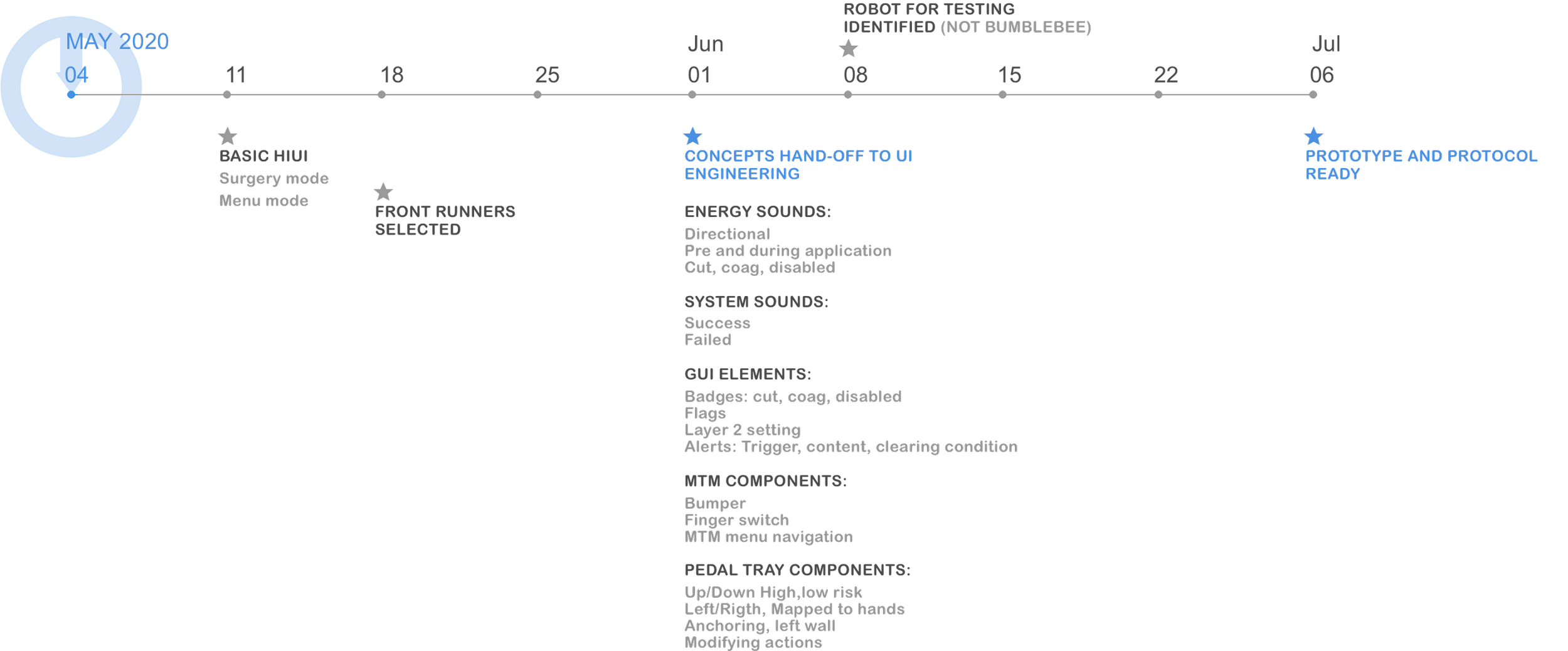 I first aligned with the DV5 program: partnered with the program manager to map the release schedule and critical path, then met 1:1 with mechanical, controls, software, clinical, and human-factors leads to surface risks and decision deadlines. A rapid audit of the user interface (UI) and user experience (UX) exposed gaps; I prioritized must-have intra-operative interactions and set a clear vision for “head-in” console control of energy, stapling, insufflation, and vision.