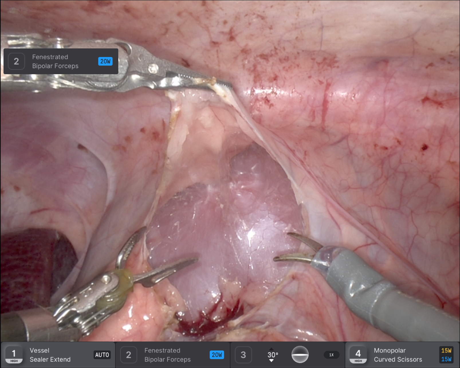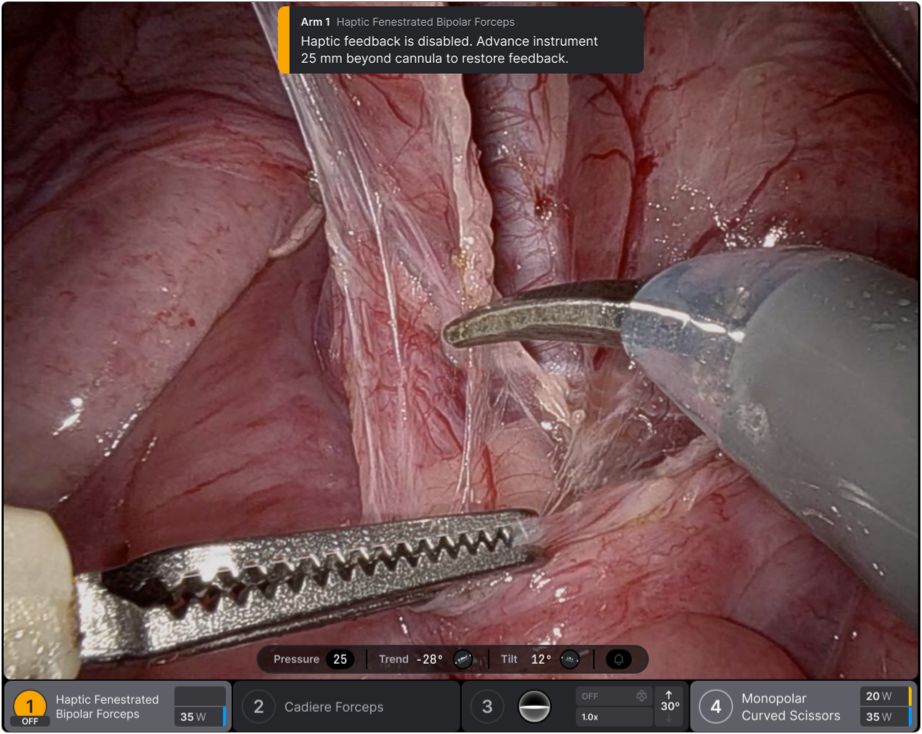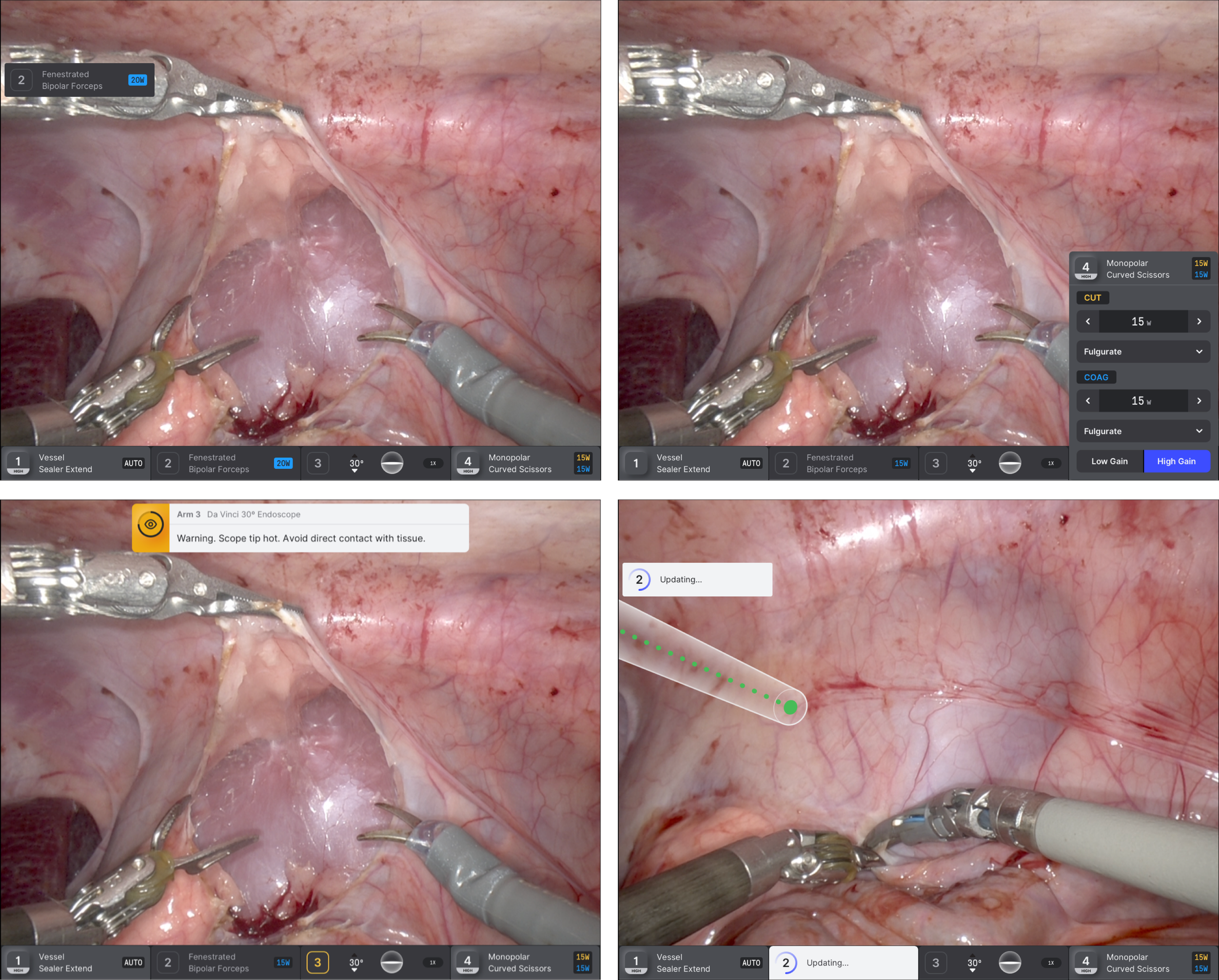 At any moment during surgery, the surgeon knows which instrument is in each hand, the active function and settings of every advanced instrument, the insufflator status, the energy module settings, and whether each instrument provides haptic (tactile) feedback.